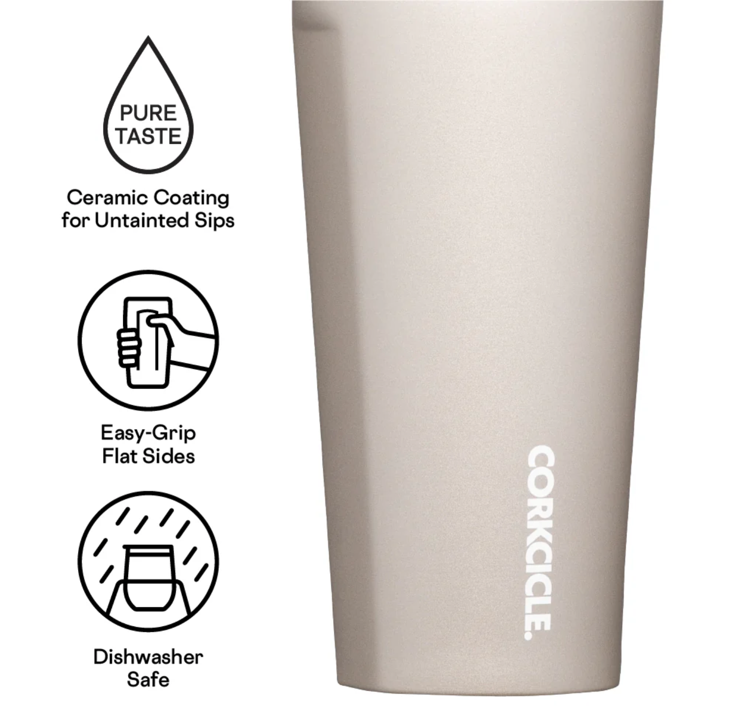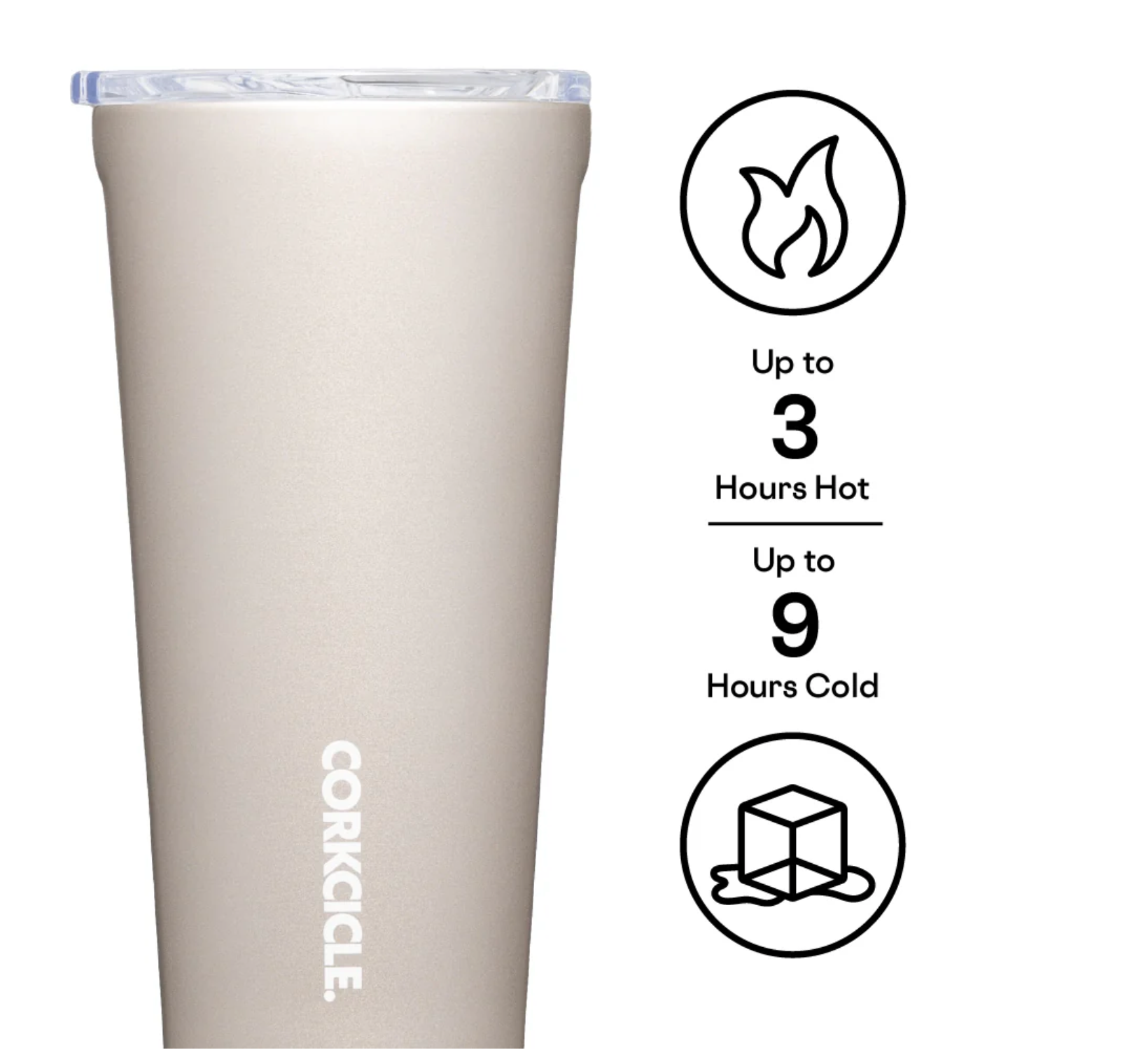 Slip-proof, silicone bottom, cold for 9 hours, hot for 3. Easy-grip, flat sides.