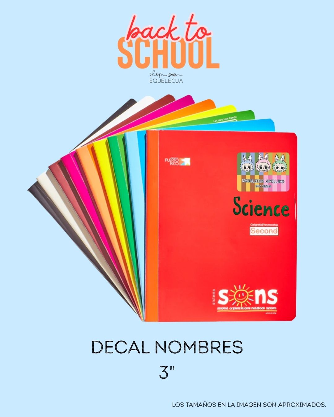Organiza las libretas de tus hijos con estilo y facilidad. Estos decals personalizados en vinyl permanente están diseñados para pegarse fácilmente en la portada de cualquier libreta o folder.