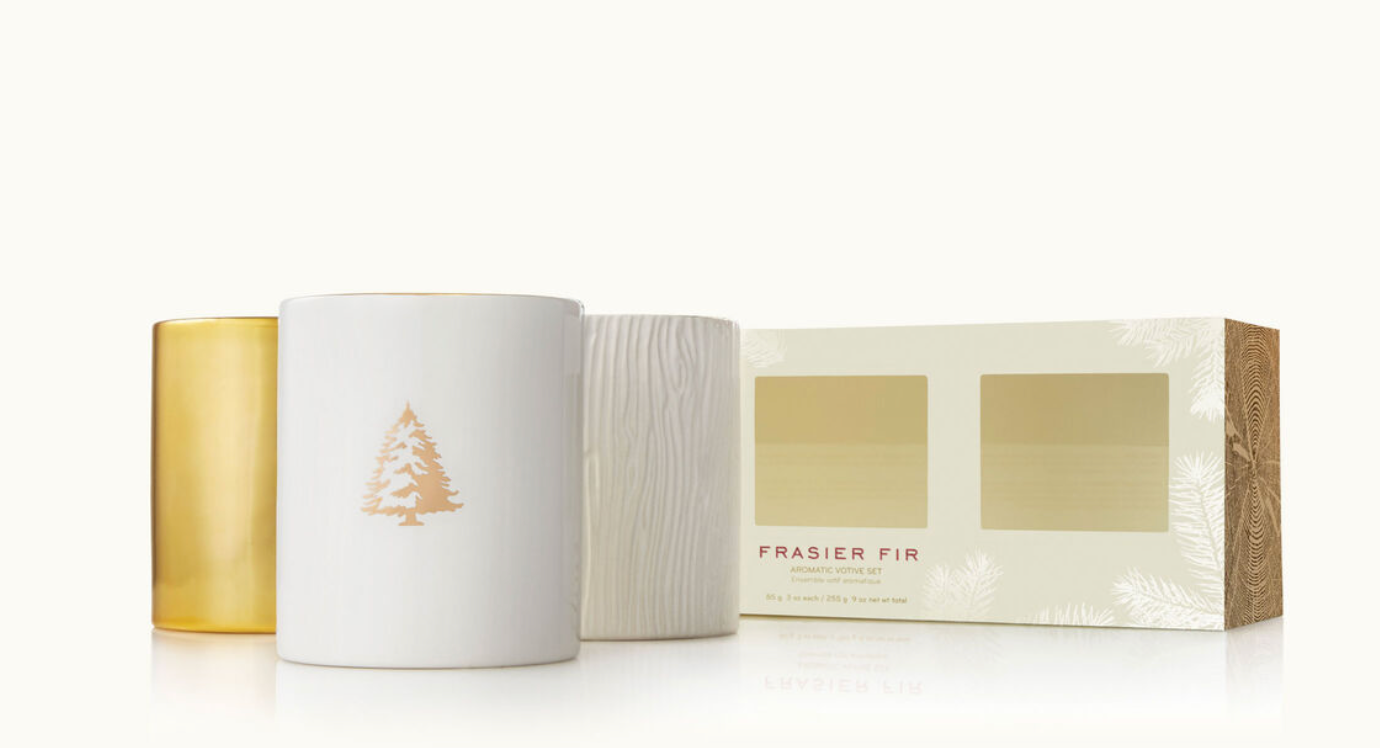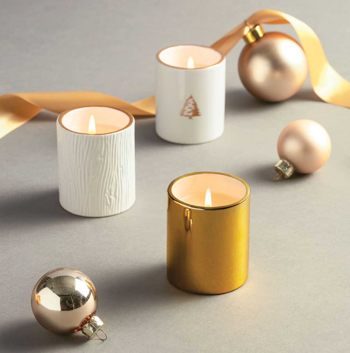 Fill your surroundings with Frasier Fir with these three assorted ceramic candles complimenting each other with winter whites, wood grains, and glistening gold.