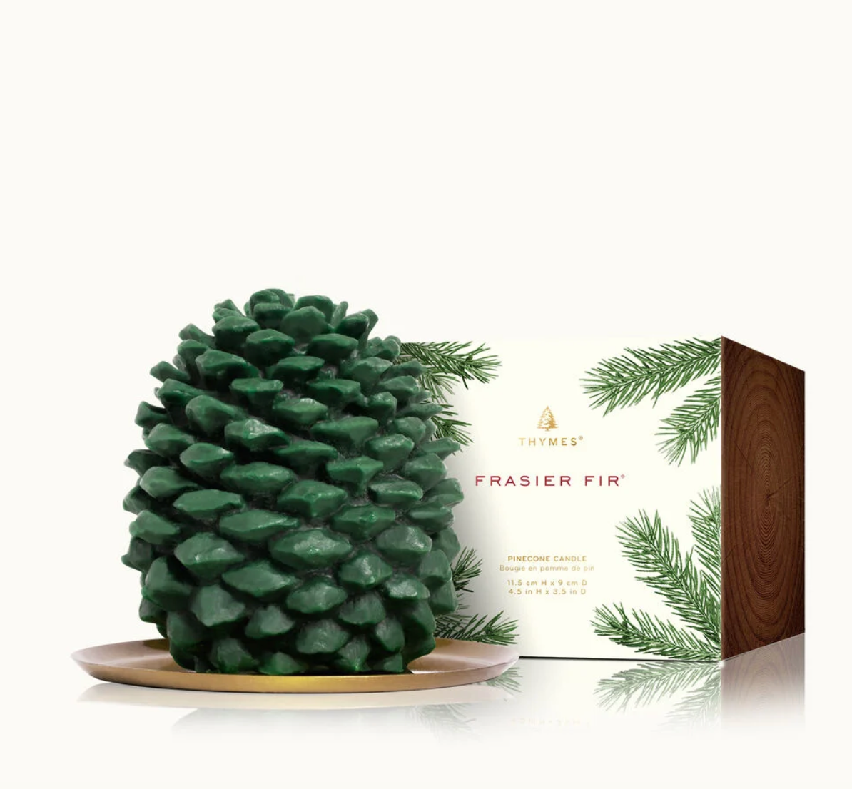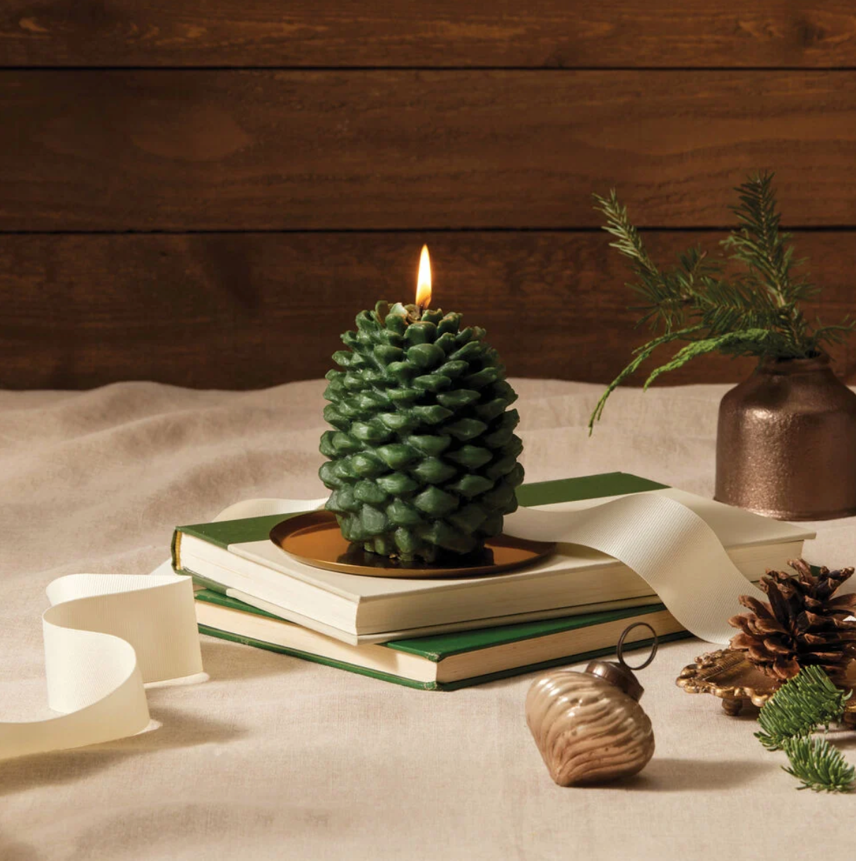 Delicately handcrafted to burn and glow beautifully, Frasier Fir's Molded Pinecone candle is sure to be the a standout in your home for this holiday season and beyond. Complete with a gold tray, the beautiful details of this deep green candle makes a unique home decor piece.