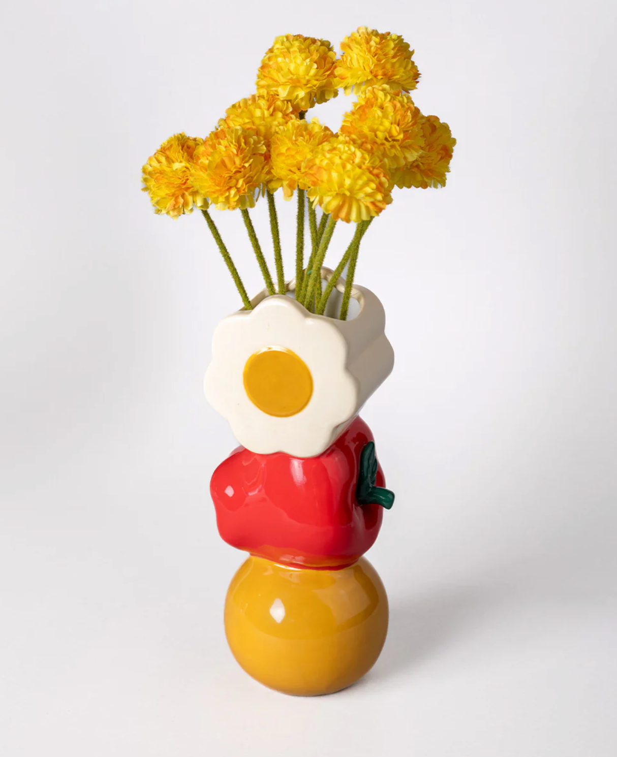 We’re not sure why, but a daisy, apple, and smiley face just make sense together. This is a ceramic vase that will look so good on your kitchen table, book shelf, or desk.