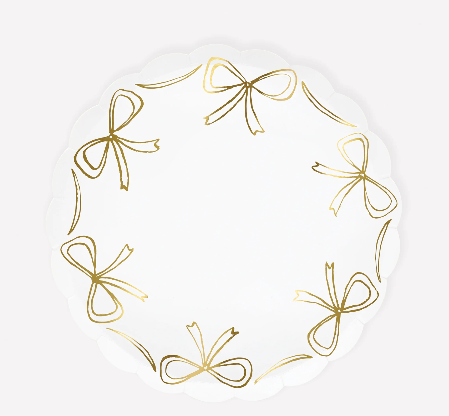 Add flair to your party with these elegant paper plates. The combination of golden bows and a scalloped border is guaranteed to bring effortless sophistication to your table, making every setting shine. Disposable plates have never been this chic and are perfect for the whole family to use. Ideal for Christmas, New Year, golden wedding anniversaries, bridal showers and special birthdays.