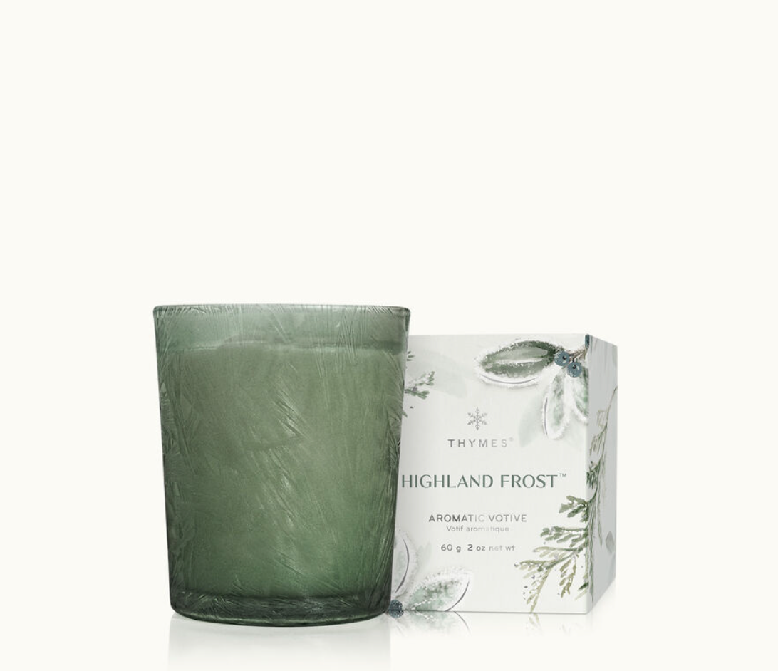 The Highland Frost Boxed Votive Candle creates a fragrance-filled experience of the familiar aroma of faded sage, frosted eucalyptus, glistening cypress needles, crystal amber and velvet moss. This petite candle is perfect for stocking stuffers, hostess gifts, and more.