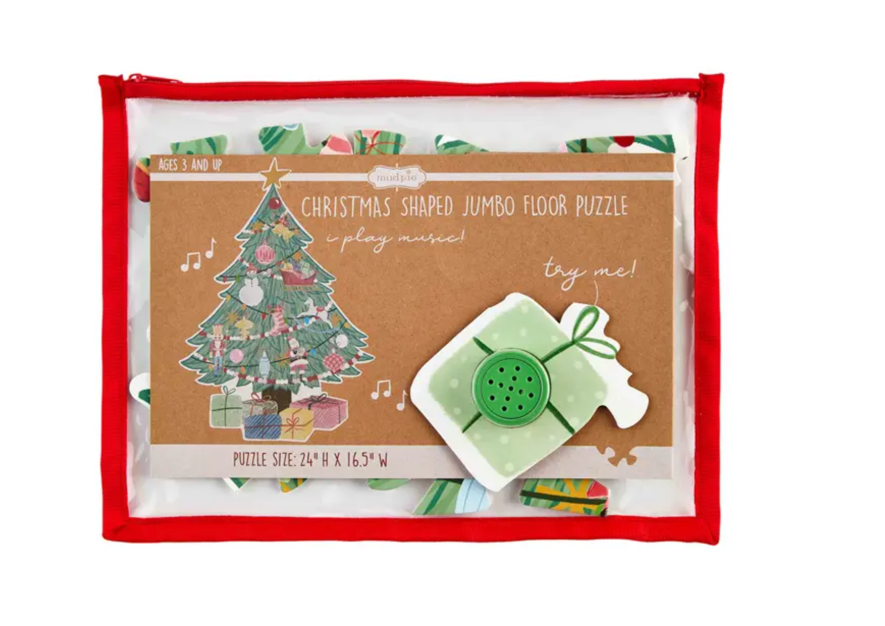 Sleigh Christmas gifting with our Jumbo Christmas Tree Puzzle, a delightful and educational toy that brings holiday cheer to young minds. This set features a jumbo floor puzzle adorned with a beautifully decorated Christmas tree, creating a festive atmosphere as children piece it together. The puzzle is accompanied by a musical button piece, adding an interactive element to the playtime experience. Crafted from high-quality paper, this puzzle is designed to engage and entertain children ages three and older. After playtime, the puzzle can be neatly stored in the included vinyl zipper storage bag, ensuring easy organization and long-lasting enjoyment. Measuring 25 3/5" x 22", our Jumbo Christmas Tree Puzzle is the perfect gift to ignite the joy of the holiday season while encouraging cognitive development and problem-solving skills in young ones.