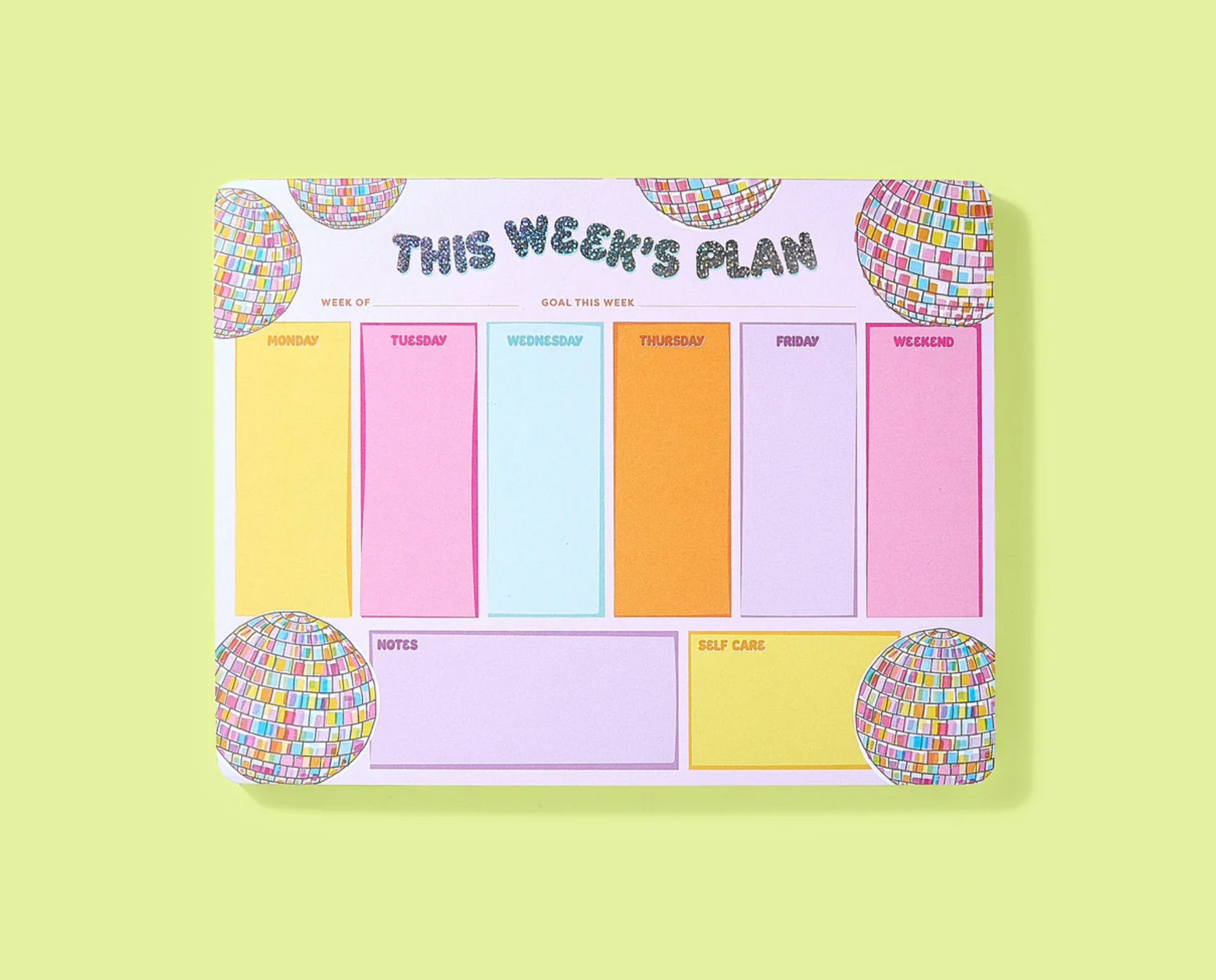 Help your customers stay organized and inspired with the Katie Weekly Planner, featuring a fun disco ball design. This planner includes dedicated sections for each weekday, a weekend area, notes, and a self-care space to encourage balance. Perfect for anyone looking for a playful yet practical planning tool that brightens up any desk and keeps busy lives on track.