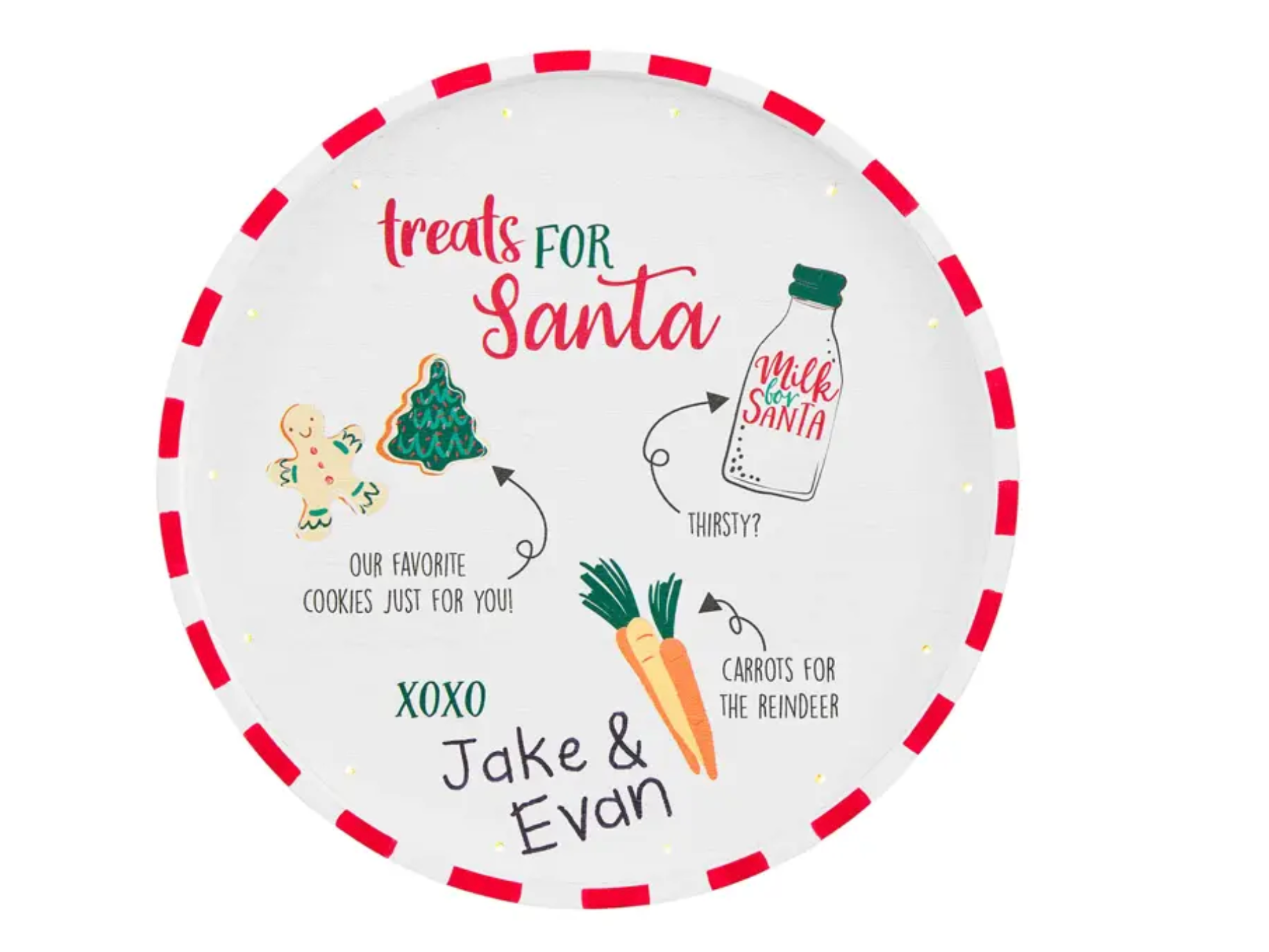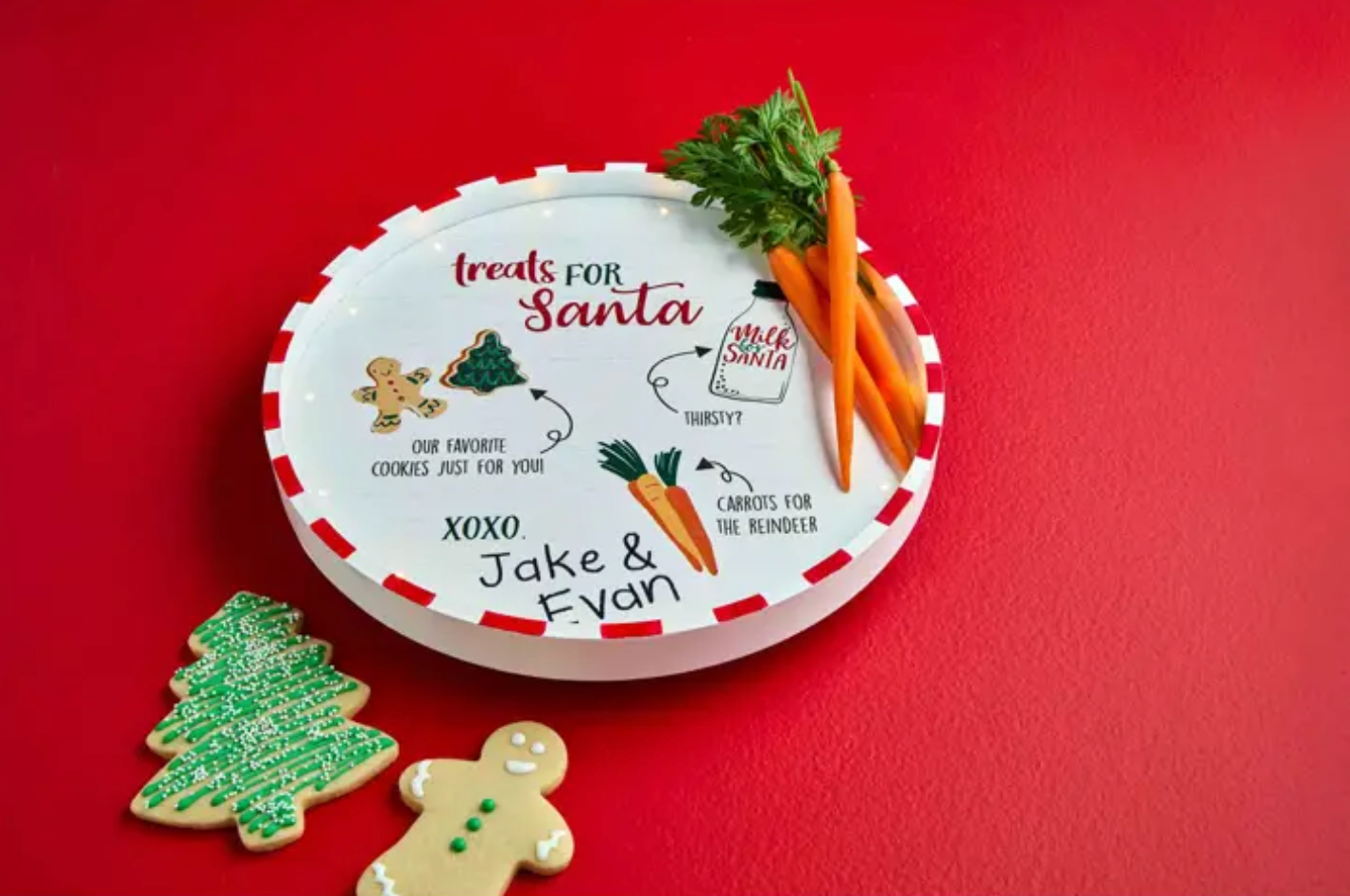 Get ready to impress Santa Claus with this enchanting Light Up Christmas Cookie Plate. Crafted from premium pine wood, this delightful plate features a captivating LED light-up rim that adds a touch of magic to your Christmas celebrations. Designed for children ages three and older, this plate serves as a charming way to display your favorite treats for Santa. Please note that two AAA batteries are required for the LED lights (batteries not included). The battery pack is conveniently located on the back of the plate for easy access. To keep this plate looking its best, simply spot clean as needed.