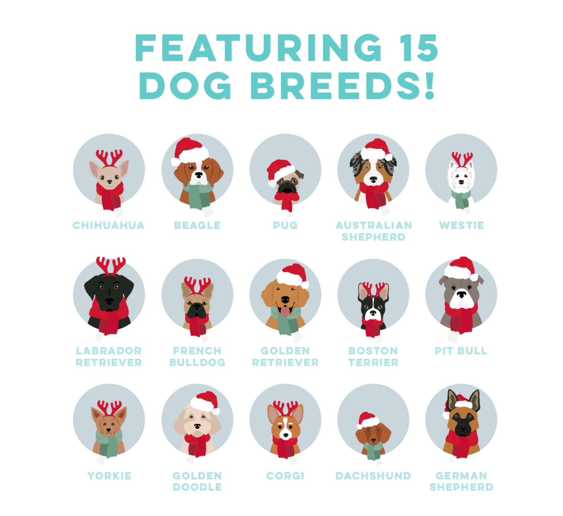 Featuring 15 dog breeds! Dachshund, Labrador Retriever, Boston Terrier, Corgi, Pug, Golden Doodle, French Bulldog, Golden Retriever, Beagle, Westie, German Shepherd, Australian Shepherd, Chihuahua, Pitbull, and Yorkie.