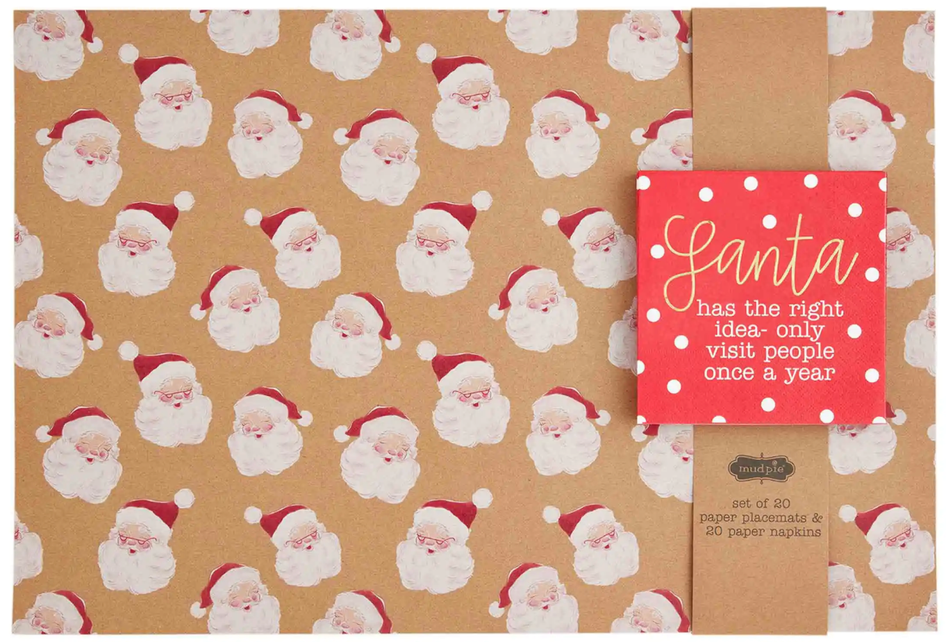 Capture the festive essence of the holidays with our Santa Placemat Set. This set includes 20 Kraft placemats adorned with a delightful Santa pattern. Each placemat boasts dimensions of 18 1/2" x 12 1/2". Additionally, the set includes 20 paper cocktail napkins measuring 5" x 5", featuring a charming Christmas sentiment. The napkins are elegantly packaged in plastic and secured with a Kraft band on top of the placemats.