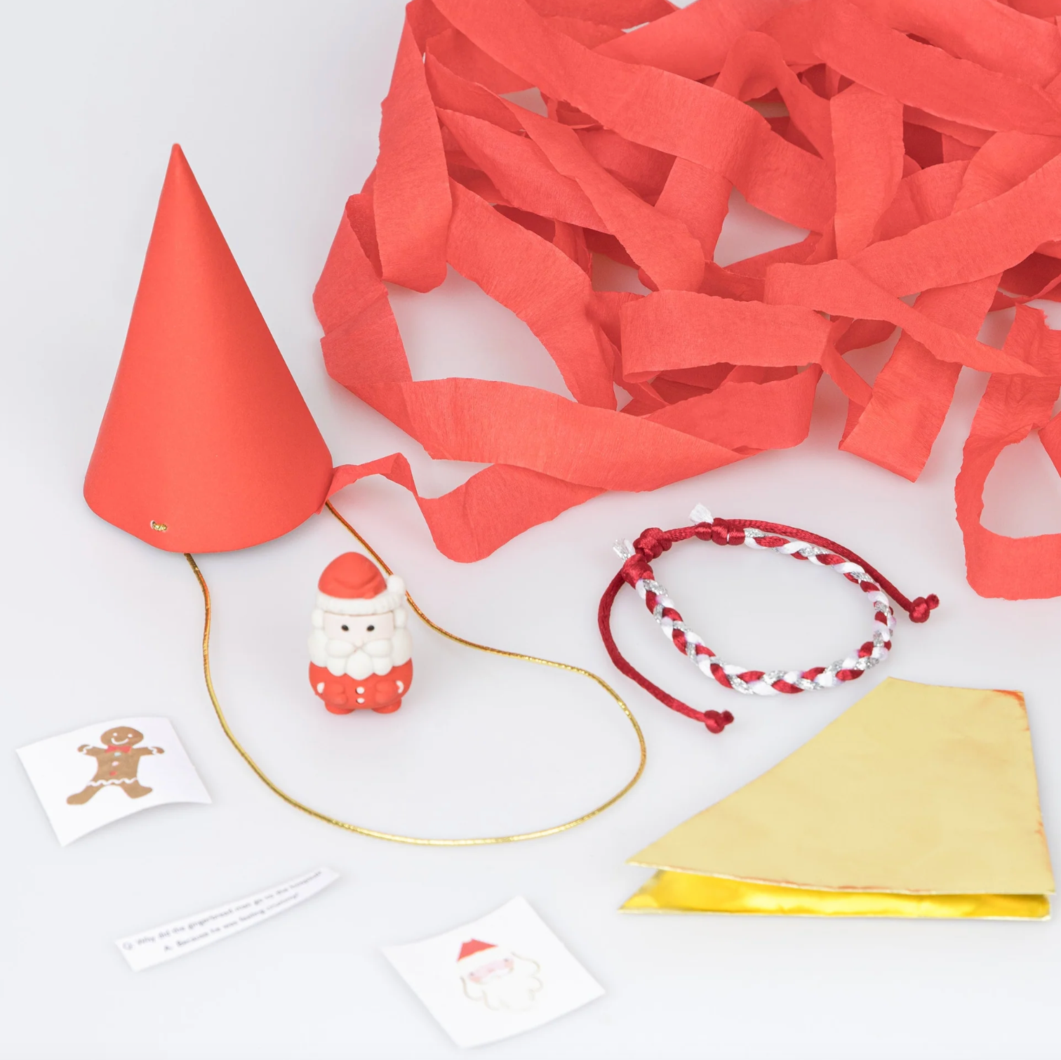 - Each hat includes a gold foil party hat, a joke, a Santa eraser, 2 stickers (one with foil), and a red/white/gold friendship bracelet