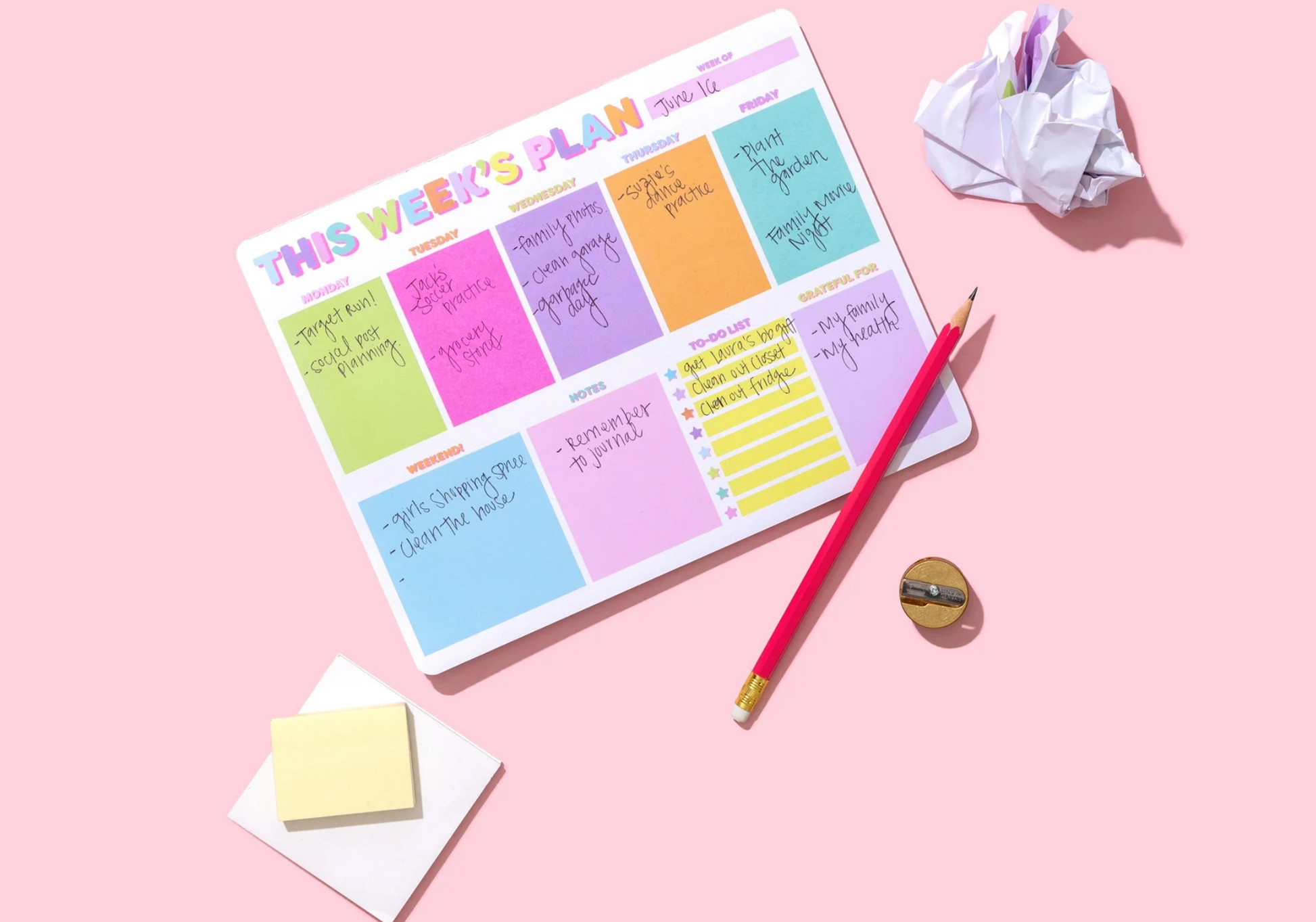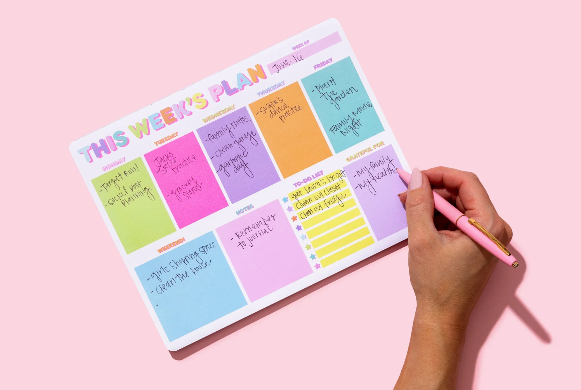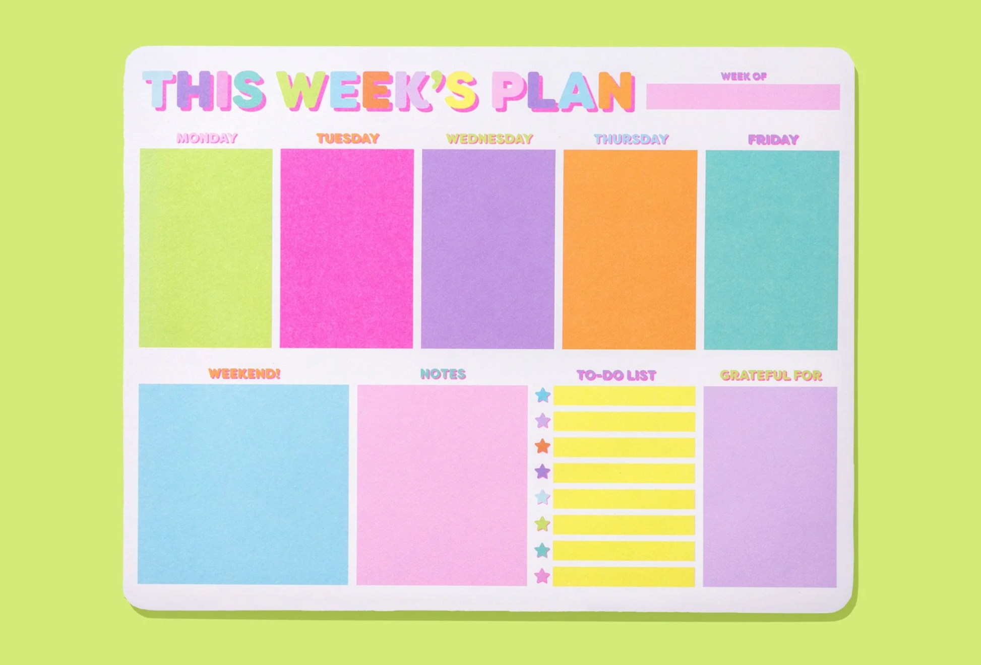 Our This Week Weekly List Pad Planner is a colorful and functional tool designed to bring order to your week. This planner features dedicated sections for each day of the week, allowing you to organize your tasks seamlessly. In addition to daily sections, we've included a general to-do section, weekend section, and a place to include what you're grateful for each week.