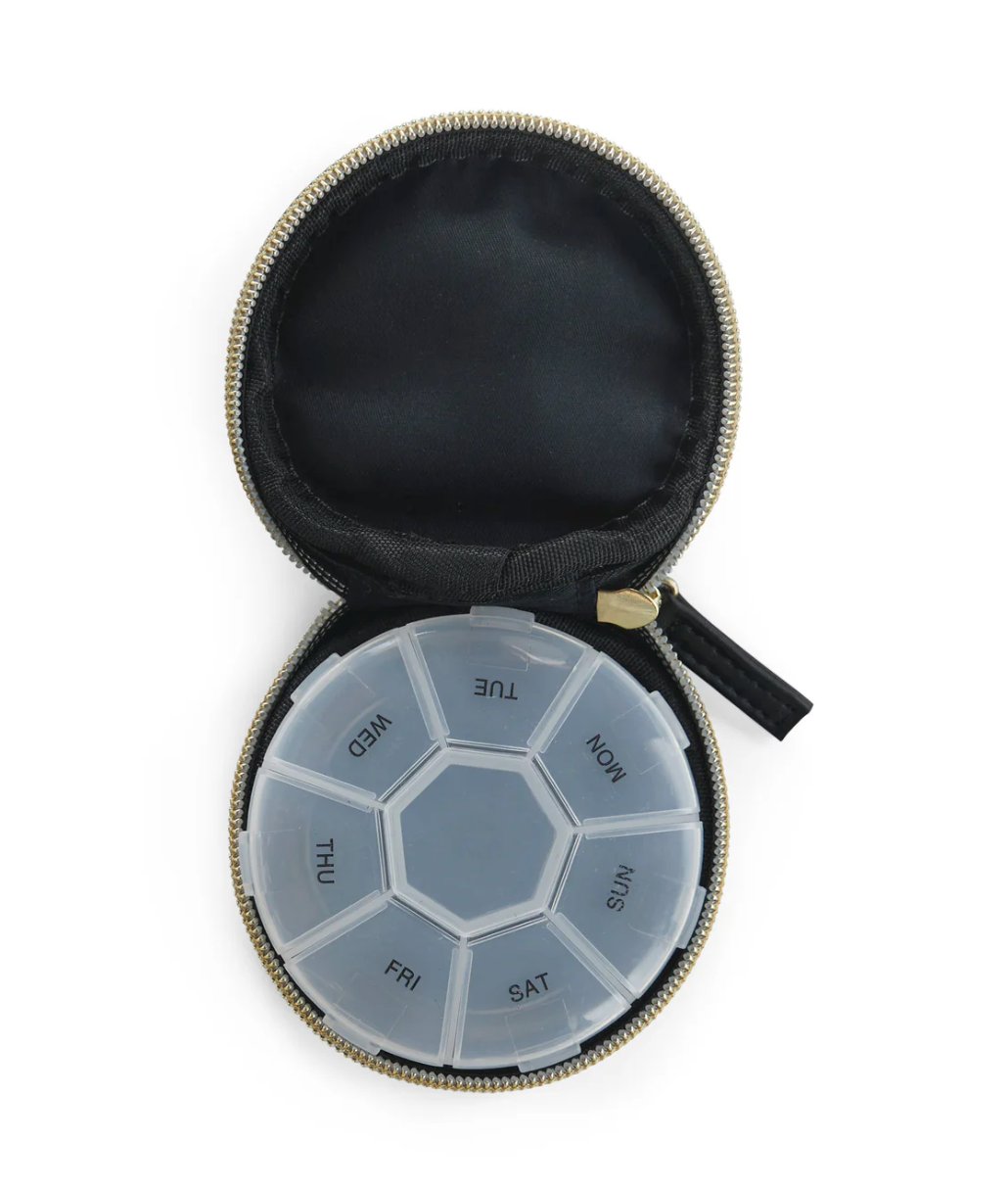 Stay organized and on track with the Vegan Leather Travel Pill Case with Tassel - "Chill Pills" from Designwork Ink. This compact travel pill case keeps your medications and vitamins organized in a cute, convenient case. Featuring labels with the days of the week and a zipper closer, all your supplements and necessities are secure and neatly stored in your bag or suitcase.